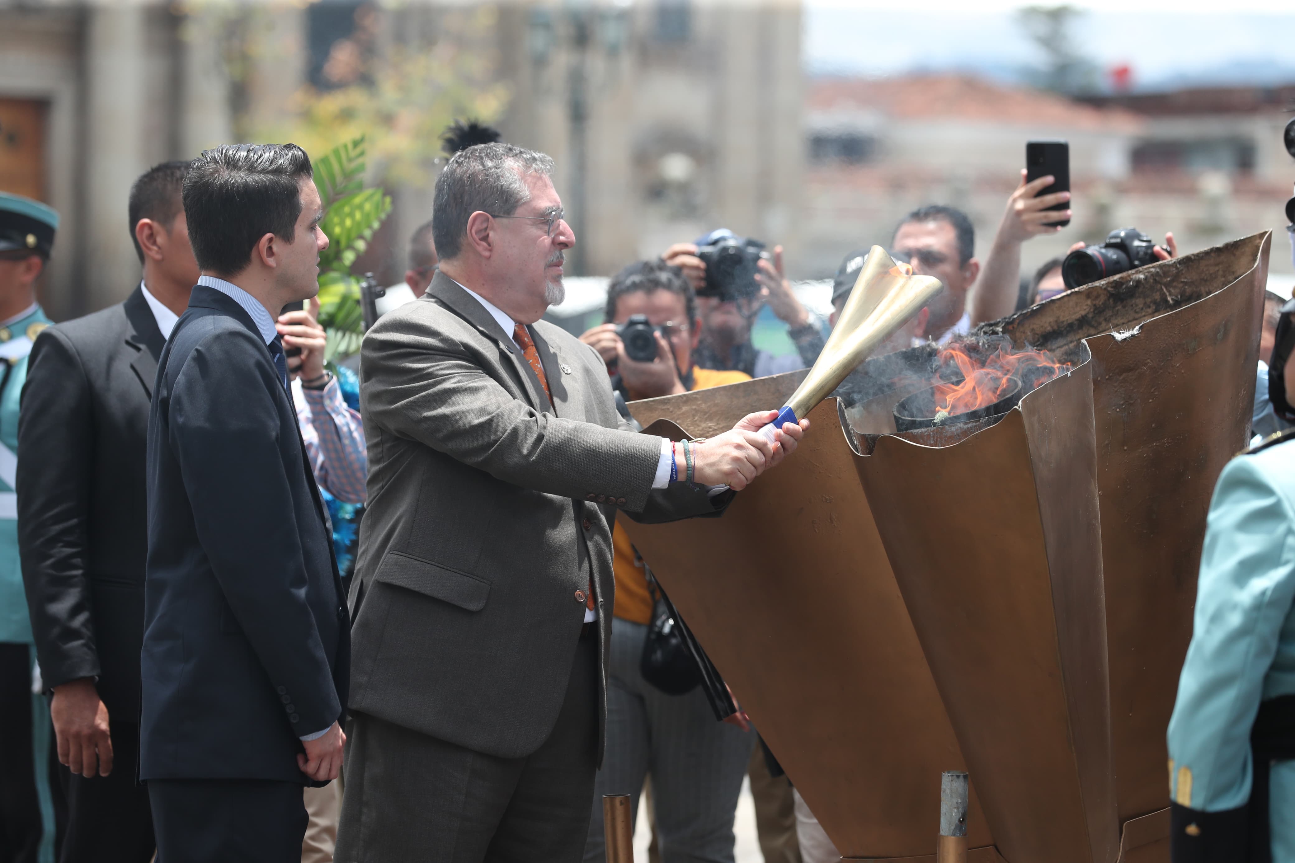 En la Plaza de la Constitución, este lunes 2 de septiembre, el presidente Bernardo Arévalo dio por inauguradas las actividades del 203 aniversario de independencia al efectuar el encendido del fuego patrio.