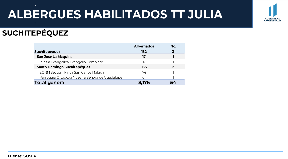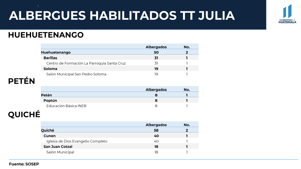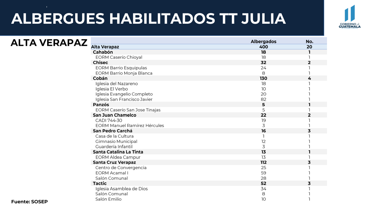 Según Conred, en total se registran 54 albergues en el territorio nacional. De este total, 26 se encuentran en Izabal, 20 en Alta Verapaz, 3 en Suchitepéquez, 2 en Huehuetenango, 2 en Quiché y 1 en Petén.