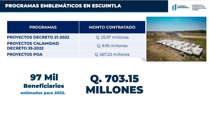 Aparte, a través del Ministerio de Comunicaciones, Infraestructura y Vivienda se efectuarán proyectos por 2 mil 9.88 millones de quetzales, con lo cual se beneficiará a un millón 142 mil guatemaltecos.