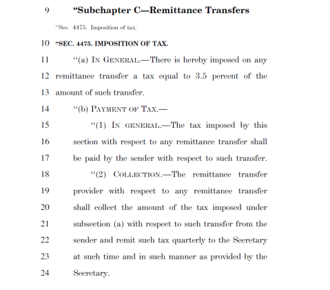 La iniciativa dice que «El impuesto con respecto a cualquier transferencia de remesas será pagado por el remitente con respecto a dicha transferencia».