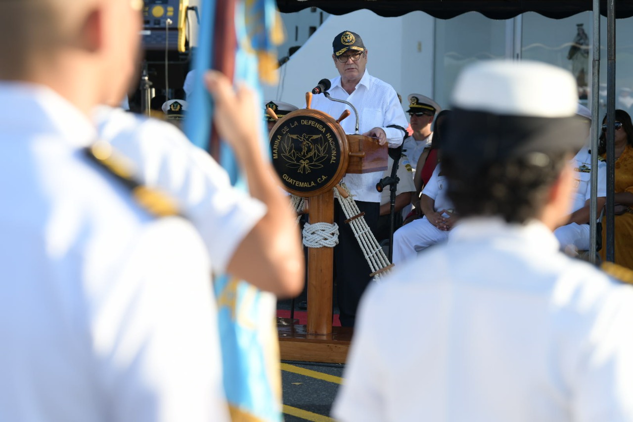 Tripulantes de la Marina de la Defensa Nacional les ordenó que sigan dejando la estela imborrable de logros que hasta el momento han trazado en nuestras aguas jurisdiccionales, refirió el presidente Giammattei.