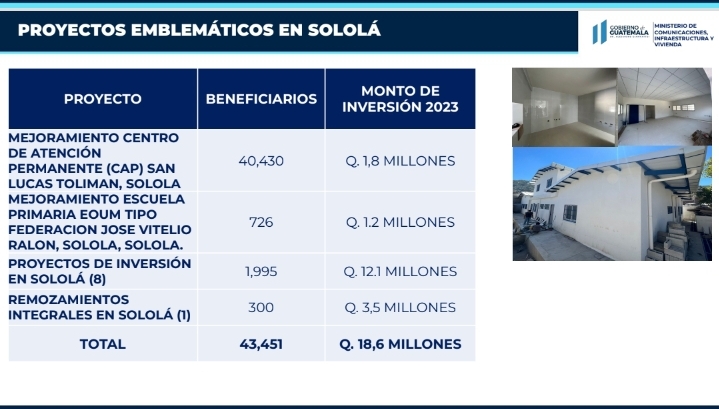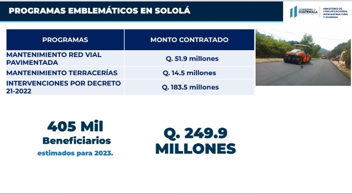 También, a través del Ministerio de Comunicaciones, Infraestructura y Vivienda, se beneficiará a 758 mil usuarios y mil 203 familias. Por ello, la cartera destinará para Sololá 679.3 millones de quetzales para ejecutar iniciativas como: