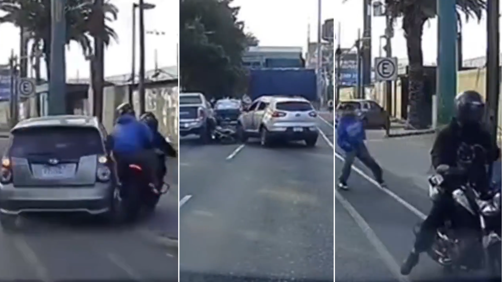 En un video captado por otro conductor, se ve cómo la camioneta agrícola, en la que viajaban las víctimas del asalto, atropelló a los dos atacantes que viajaban en motocicleta.