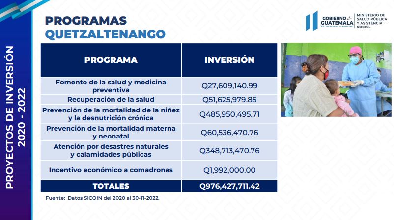 El Ministerio de Salud Pública y Asistencia Social manifestó que a través de la Dirección de Área de Salud de Quetzaltenango se han ejecutado proyectos de impacto que han significado una inversión de 976 millones 427 mil 711 quetzales. Entre estos se encuentran los siguientes: