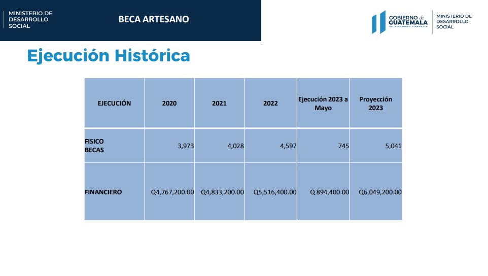 En lo que va de este año, Beca Artesano ha beneficiado a 745 personas con una ejecución que alcanza los 894 mil 400 quetzales. En tanto, las autoridades informaron que se pretende cerrar este año con una ejecución de 6 millones 49 mil 200 quetzales.