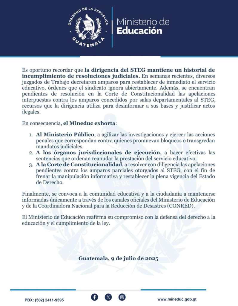 “Exhortamos a los órganos jurisdiccionales de ejecución a hacer efectivas las sentencias que ordenan reanudar la prestación del servicio educativo. y a la Corte de Constitucionalidad a resolver con diligencia las apelaciones pendientes contra los amparos parciales otorgados al Steg, con el fin de frenar la manipulación informativa“. finaliza el comunicado del ministerio.