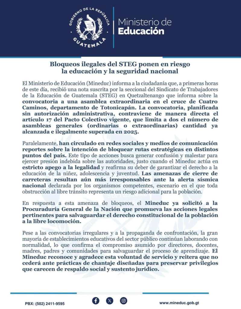 El Ministerio de Educación (Mineduc) emitió un comunicado este 9 de julio en donde se pronuncia por supuestos reportes que indican la intención del Sindicato de Trabajadores de la Educación de Guatemala (Steg) de bloquear diferentes rutas del país.