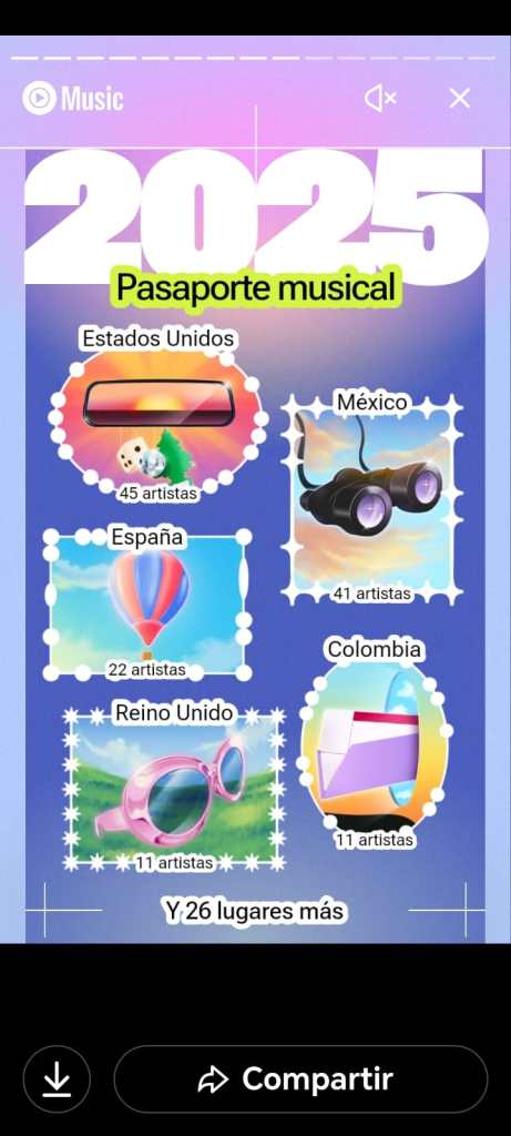 Uno de los elementos destacados es el “alma gemela musical”: el artista que más se ha escuchado a lo largo del año. También se genera un “pasaporte musical” con un resumen de los países de origen de los artistas más escuchados.