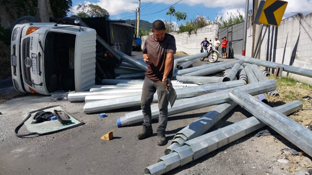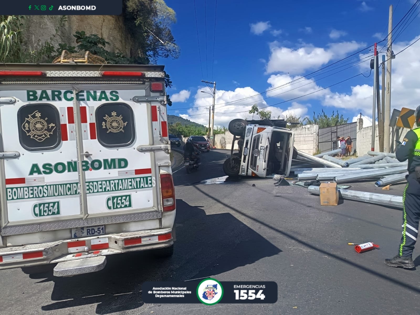 Camión vuelca en Bárcena, Villa hacia Santa Lucía Milpas Altas