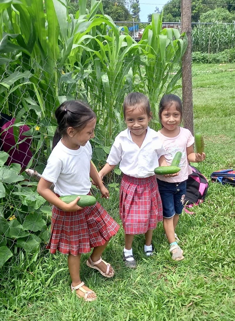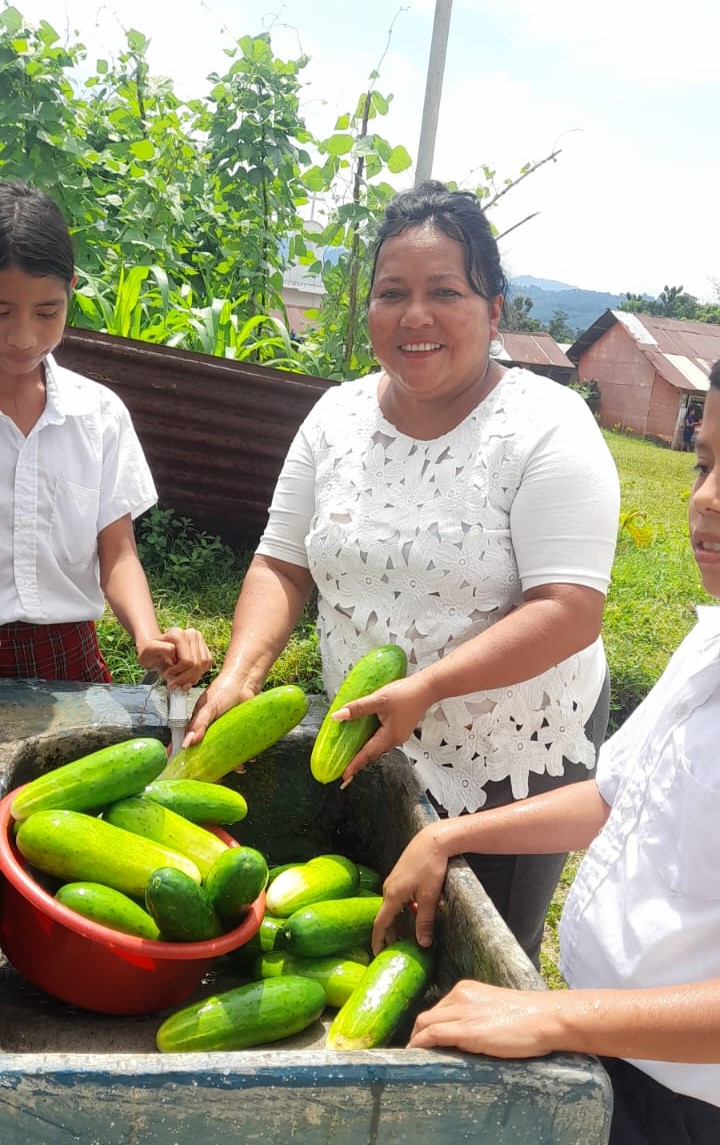 Estudiantes y docentes orientados por padres de familia desde la preparación del terreno, la aplicación de abono y la cosecha de pepinos esperan con emoción en los próximos meses cosechar frijol, maíz, chile jalapeño y ayote.