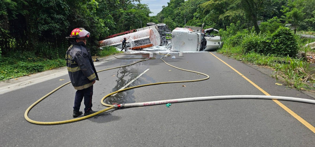 Un accidente de tránsito se registró esta mañana en el kilómetro 202 de la ruta al Pacífico, donde una pipa de combustible quedó volcada.