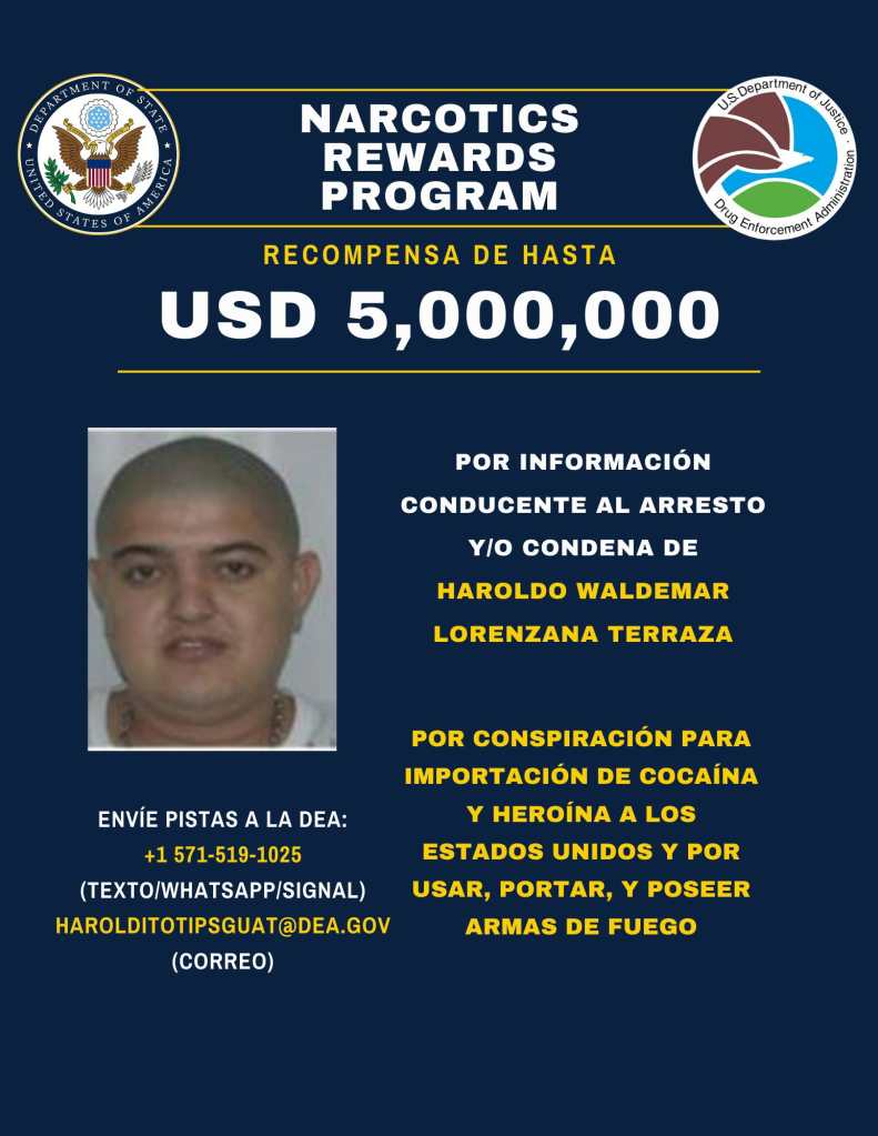 El Departamento de Estado ofrece hasta US$5 millones (más de Q38 millones) por información que conduzca al arresto y condena de Haroldo Waldemar Lorenzana Terraza, alias Haroldito, integrante de la estructura conocida como los Lorenzana.