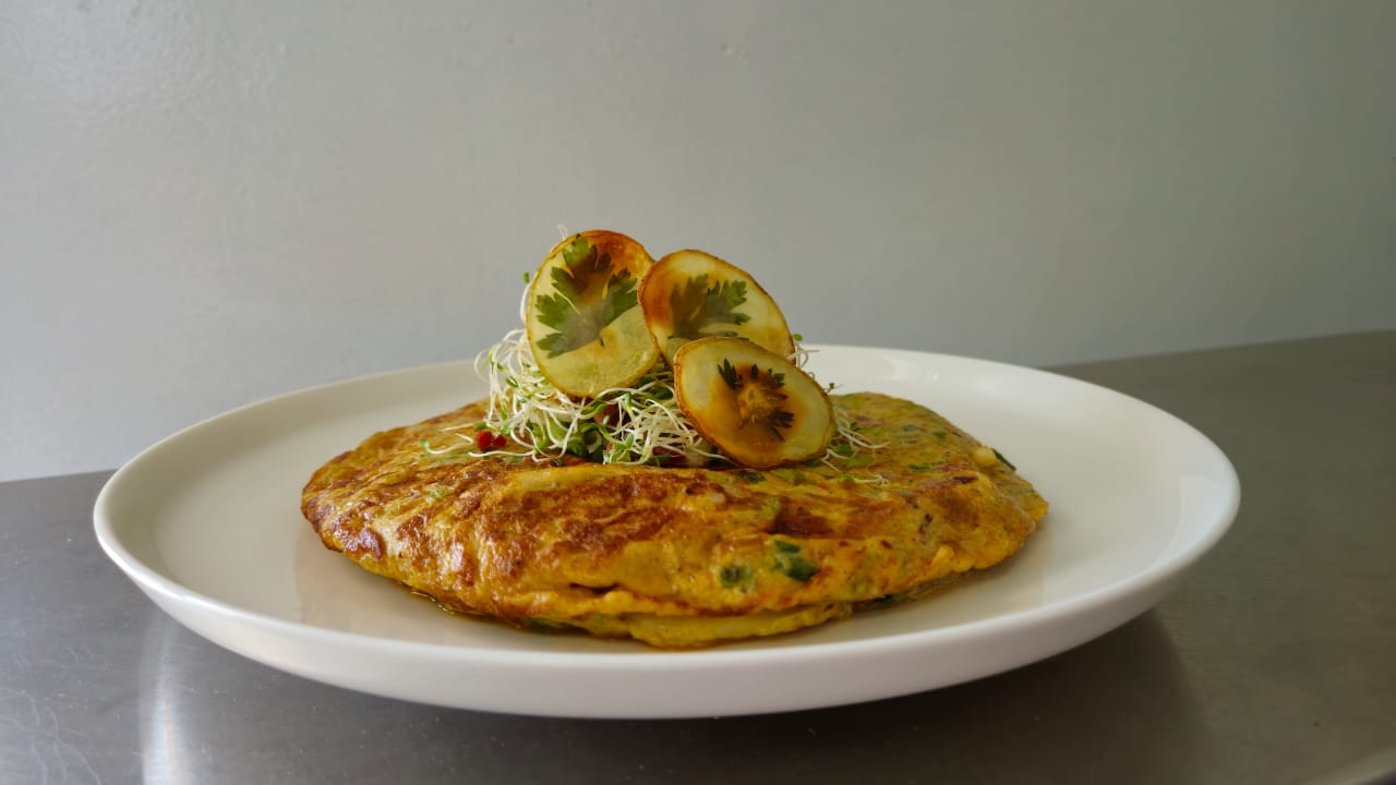- Servir la tortilla española en un plato y decorar con cebollín, tocino y unos chips de papa.