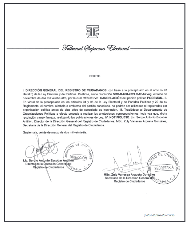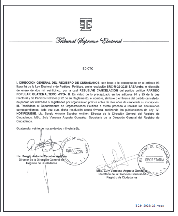 El Tribunal Supremo Electoral (TSE) oficializa la cancelación de los partidos políticos Podemos y Partido Popular Guatemalteco (PPG), relacionados con Roberto Arzú García-Granados y Neto Bran, respectivamente.