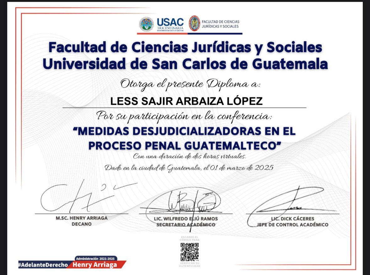 Arbaiza López también participó en marzo de este año en una conferencia organizada por la Facultad de Derecho de la USAC, donde recibió un reconocimiento del decano Henry Arriaga, identificado como cercano al rector Walter Mazariegos.