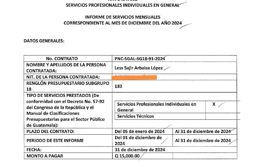 El primer contrato data del 2023, y el segundo, vigente durante todo el 2024, corresponde al primer año de gestión Francisco Jiménez como ministro de Gobernación. El contrato de 2024 es por un total de Q180 mil.