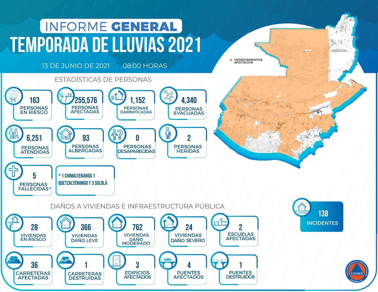 La temporada de lluvias en 2021 en Guatemala ha dejado 5 muertos y 255 mil 576 afectados por inundaciones, deslaves de tierra y daños en infraestructura en varias regiones del país, informó este domingo 12 de junio la Conred.