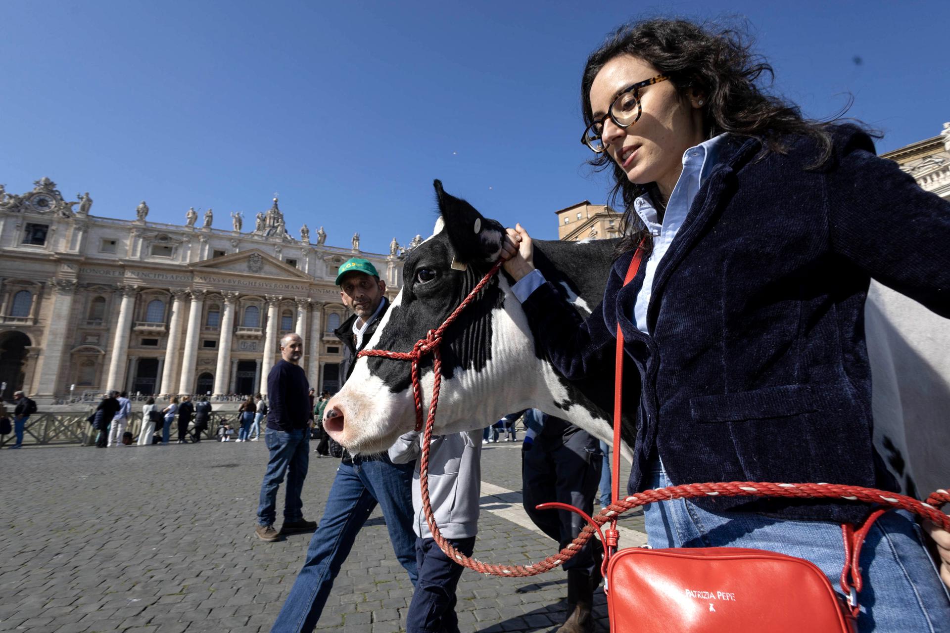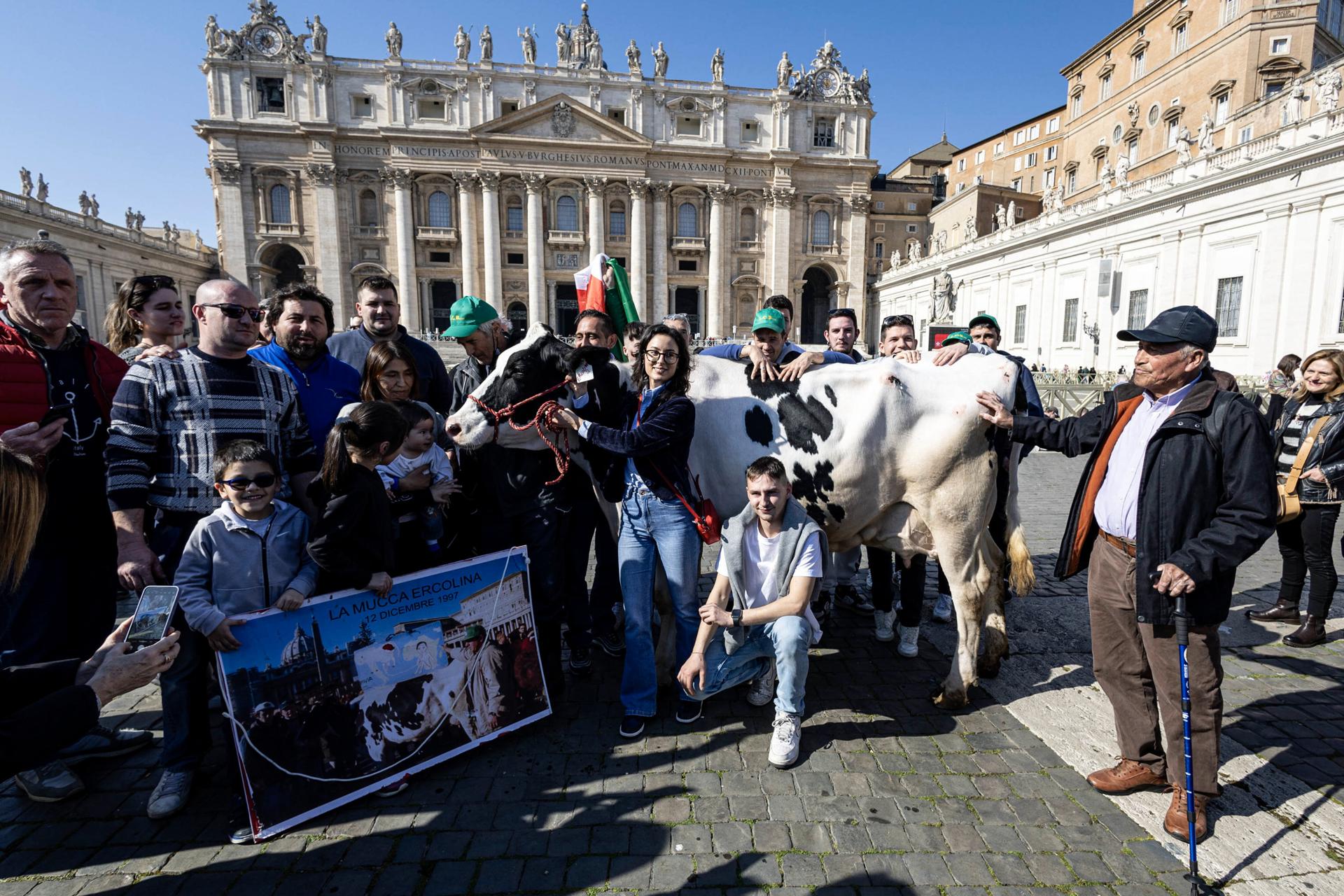 Una delegación del Movimiento Agrícola Federado llegó hasta la plaza de San Pedro con dos de sus mayores símbolos: un tractor y la vaca Ercolina, que ya estuvo presente hace en el Festival de San Remo, el famoso certamen de la canción italiana.