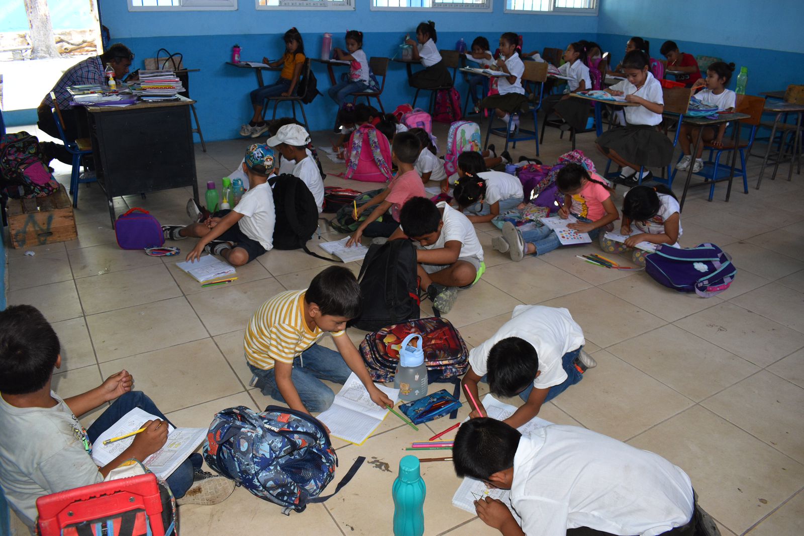 Con crayones y lápices en mano, varios niños de Zacapa se recuestan o se sientan en el suelo para recibir clases. Y es que en la Escuela Oficial Urbana Mixta, en el departamento de oriente, escasean los pupitres.