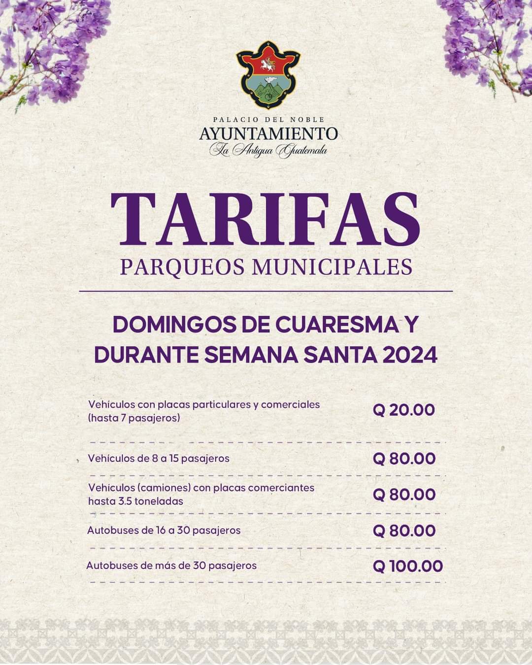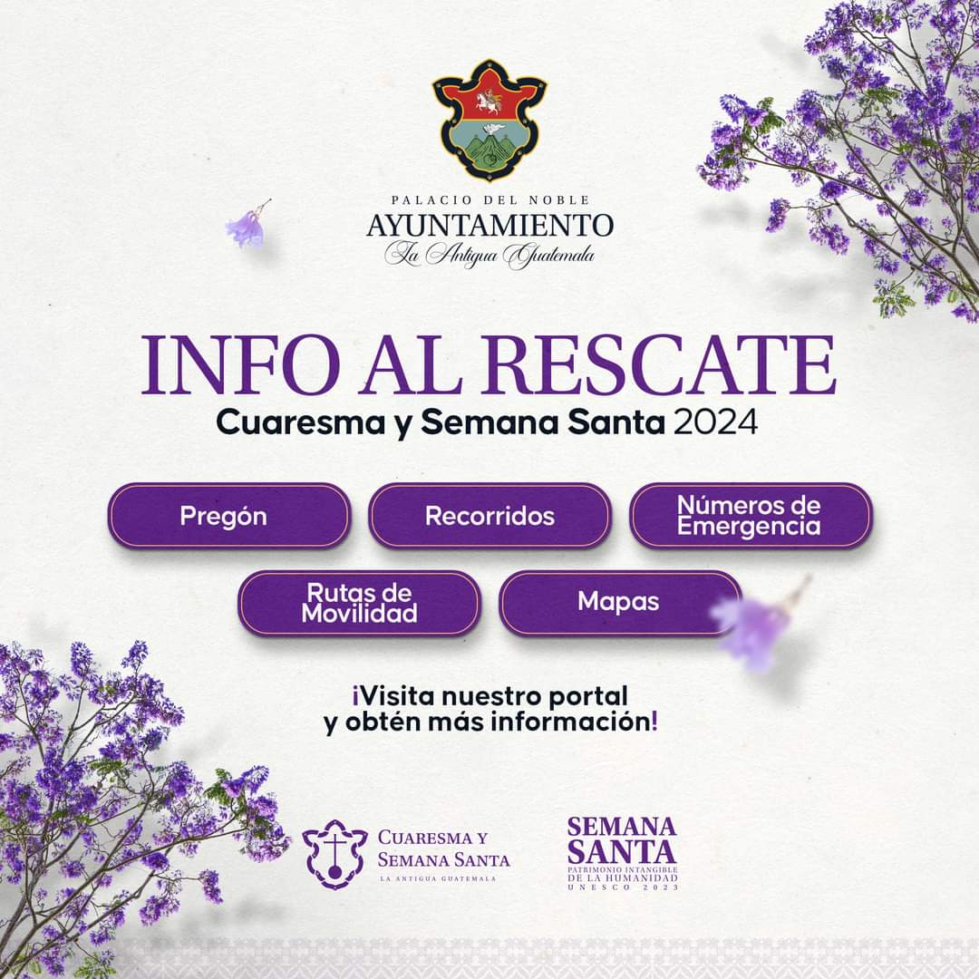 En ese sentido, el Ayuntamiento de la Antigua Guatemala ha habilitado parqueos municipales y privados en la periferia del casco urbano, con capacidad para 5 mil vehículos. El objetivo es evitar la congestión vehicular las calles, resguardar la solemnidad de estas tradiciones. Además de garantizar la seguridad de los visitantes y feligreses que recorren las calles durante esta época de reflexión y fervor religioso. En ese sentido, las autoridades locales recomiendan a la población lo siguiente: