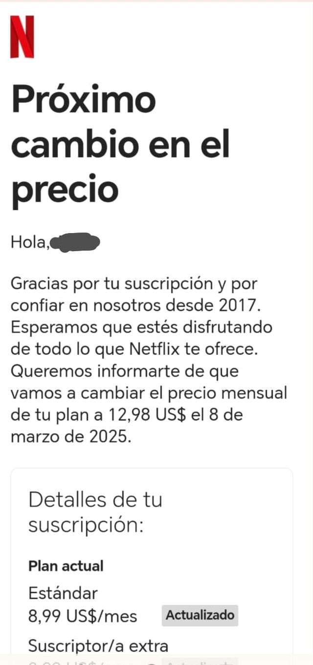 Sin embargo, se dio a conocer que este incremento en la suscripción entraría en vigor en nuestro país durante marzo de 2025.El primer cambio se reportó en la suscripción al plan estándar, el cual tenía un costo de US $8.99 mensuales y ahora incrementaría a US $12.98 a partir de marzo de 2025.
