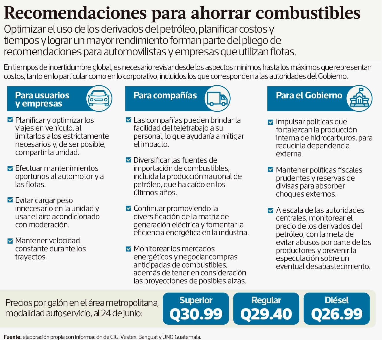 Para el mercado local, se esperarían disminuciones de precio en los próximos días, luego de haberse registrado alzas de hasta Q2 en el galón de diésel y de Q1.20 en las gasolinas, durante las últimas dos semanas. El precio observado en las estaciones de servicio en el área de metropolitana es de Q30.99 para superior; Q29.49 para regular y Q26.99 diésel en la modalidad de autoservicio.