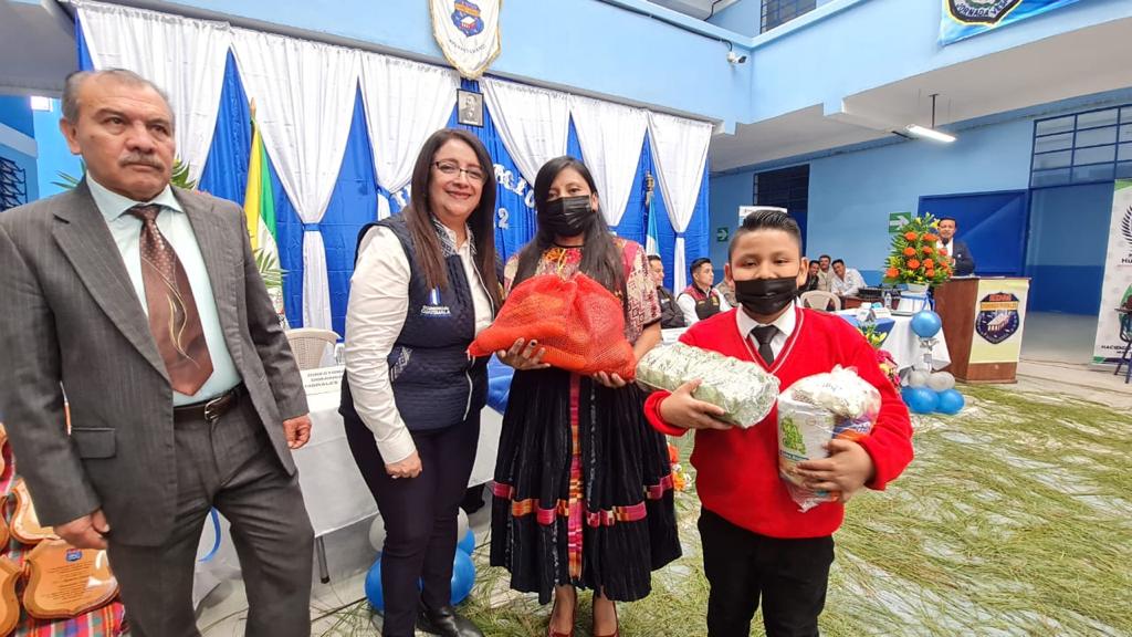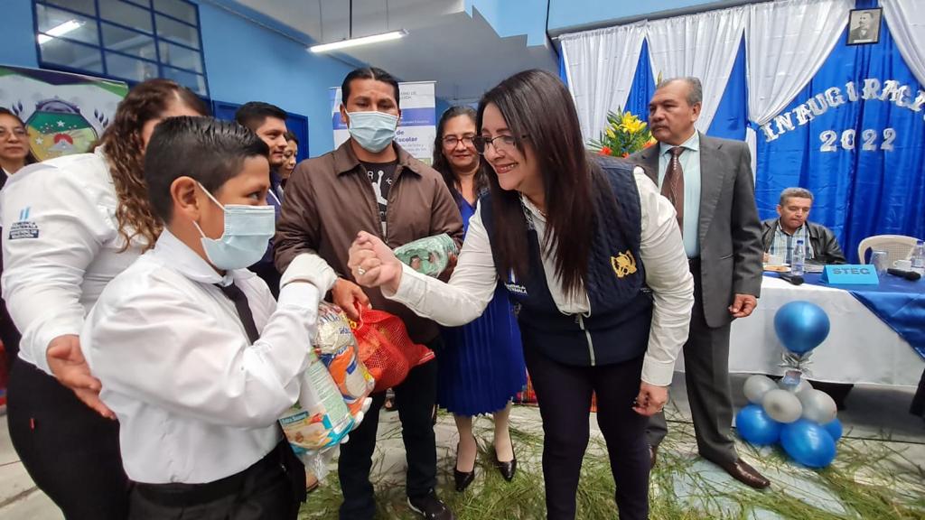 Como parte de su visita al lugar, la ministra hizo la entrega simbólica de la séptima dotación de alimentos escolares a la organización de padres de familia y Dirección Departamental de Educación.