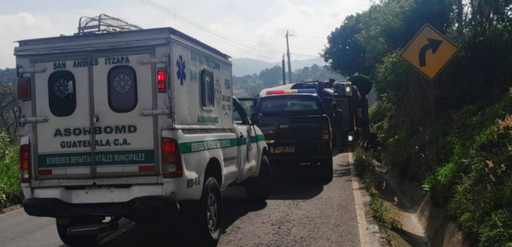 Esta mañana se registró un accidente de tránsito en el municipio de San Andrés Itzapa, donde un bus volcó sobre la cinta asfáltica.