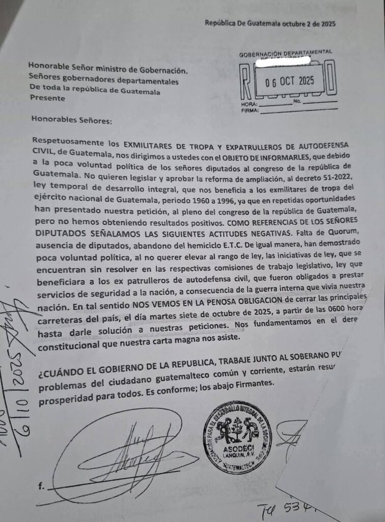 Exmilitares y expatrulleros de Autodefensa Civil de Guatemala anunciaron que el próximo martes 7 de octubre iniciarán una serie de manifestaciones y bloqueos en las principales carreteras del país, en protesta por la falta de avances en la reforma del Decreto 51-2022, Ley Temporal de Desarrollo Integral.