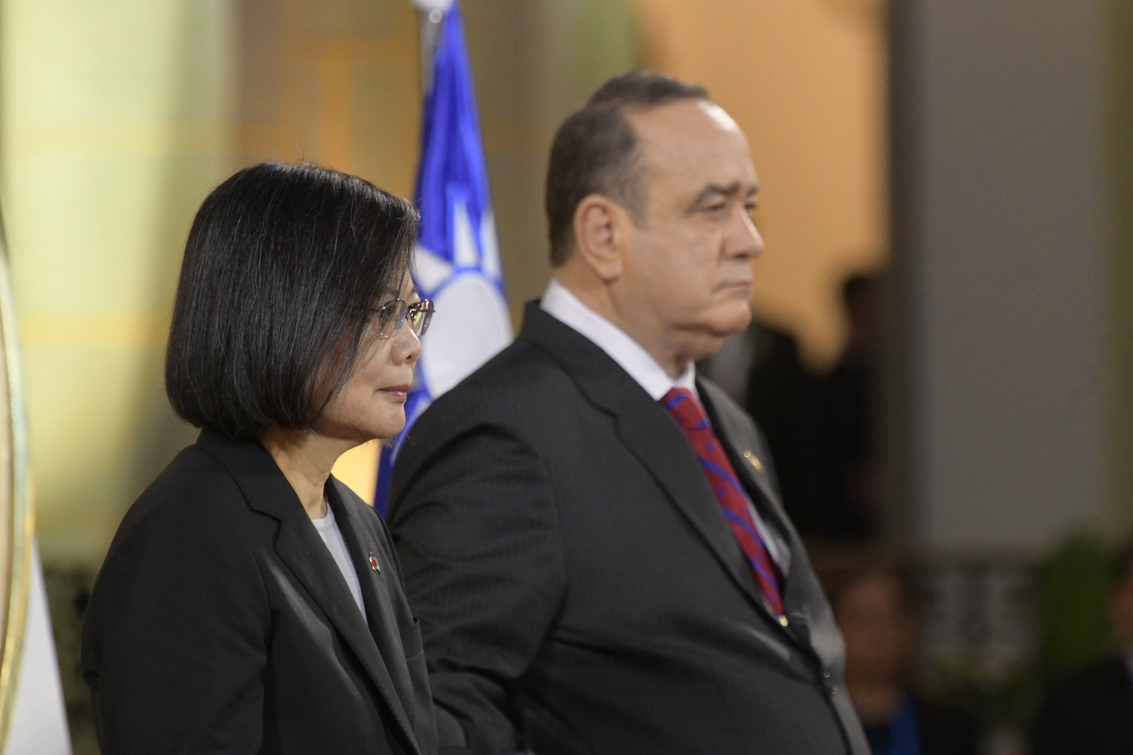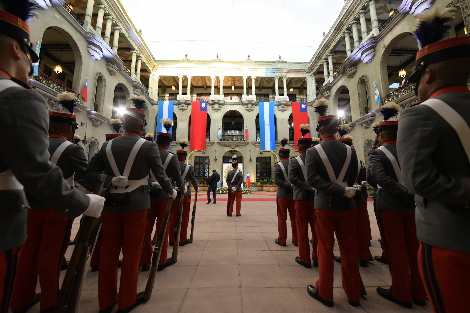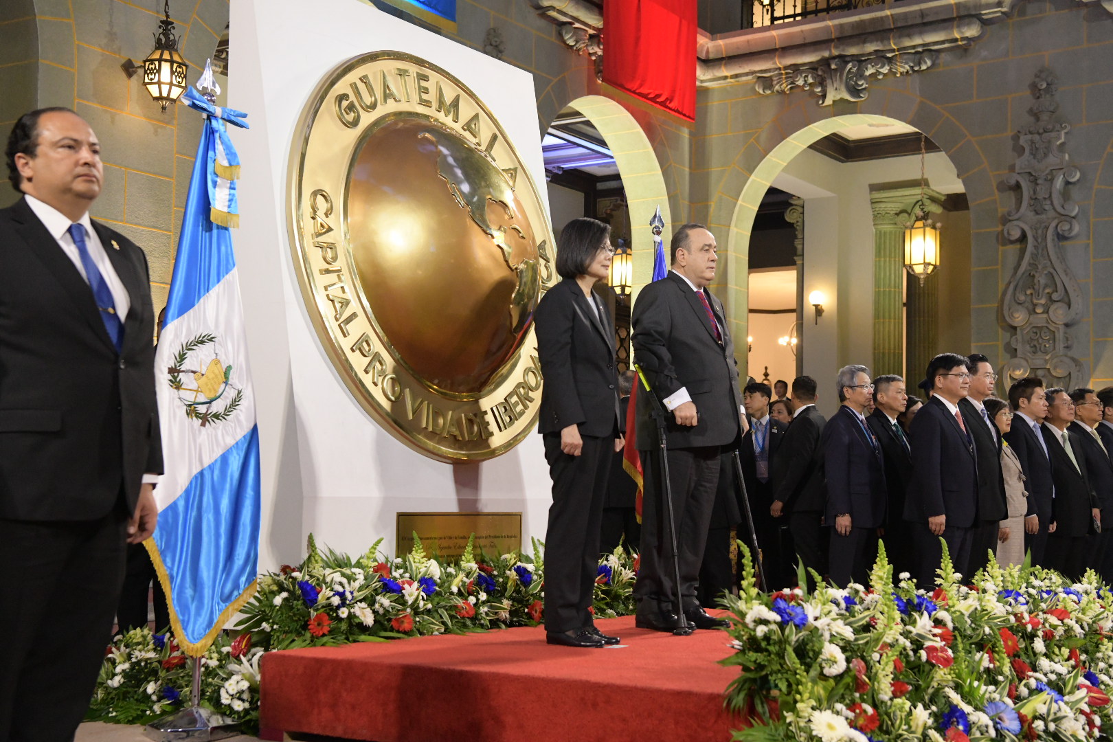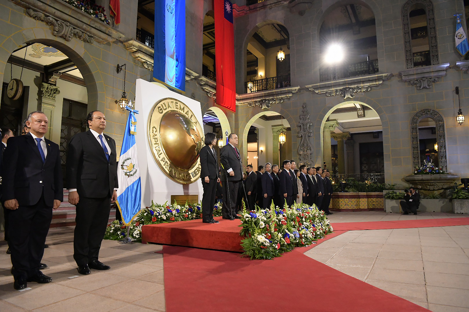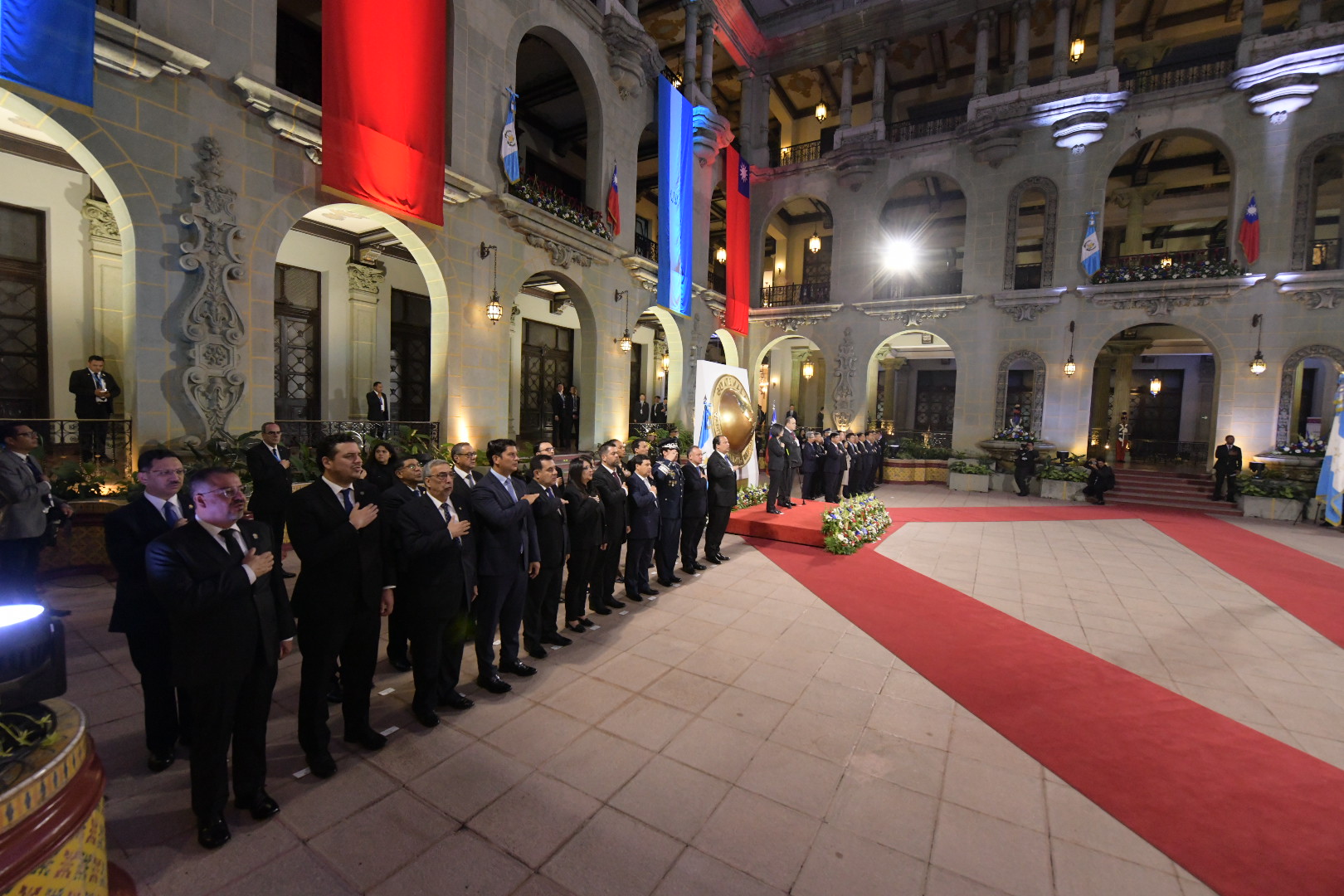 A la derecha del Presidente de Guatemala, la dignataria taiwanesa se dirigió hacia el Patio de la Vida. En ese lugar, se hicieron los honores correspondientes a las banderas de ambas naciones y se entonaron los himnos de cada una.