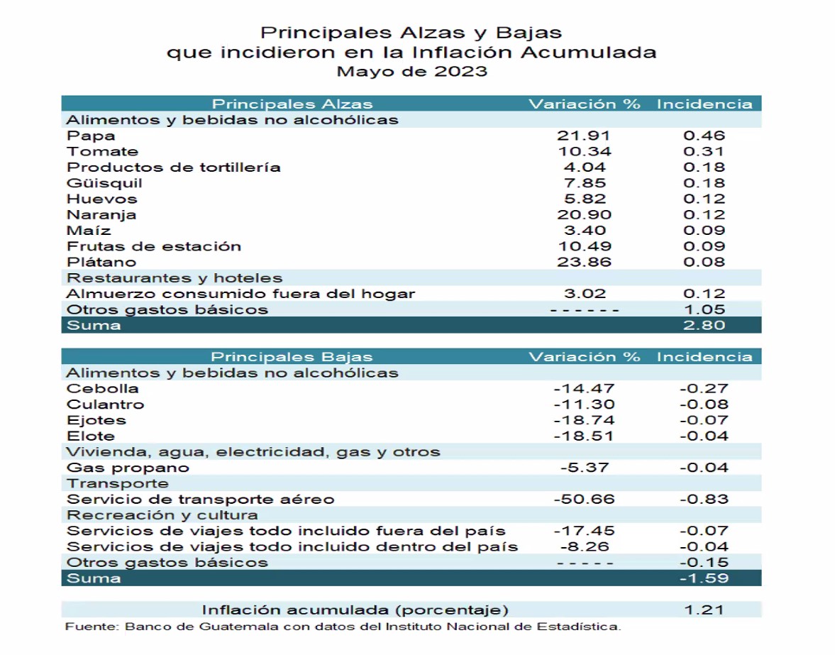 Para comparar, en mayo, la inflación de Guatemala se posicionó en 6.54 %, aliviando la escalada de precios, llevándolos a un espacio de mayor estabilidad. Entre dichos meses la inflación descendió 3.38 %.