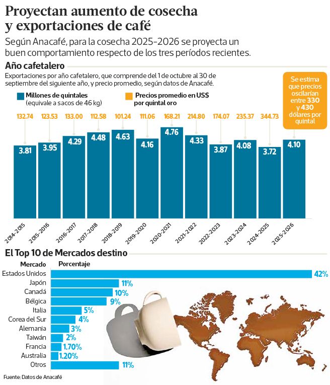 El sector cafetalero proyecta un crecimiento de 9.9% en el volumen de exportación para la cosecha 2026 y prevé que se mantengan los altos precios internacionales del grano.