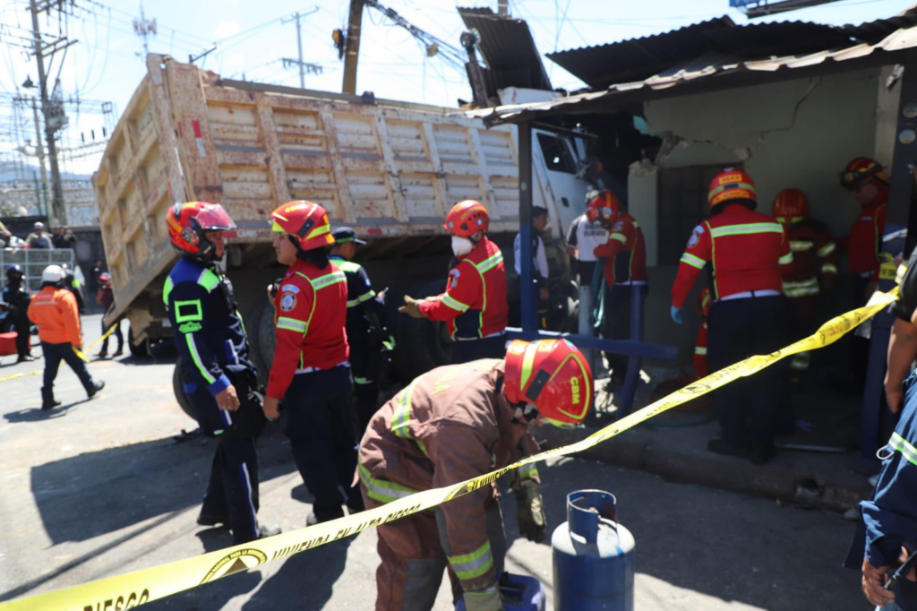 Un camión de volteo quedó empotrado en una vivienda tras impactar con varios vehículos, en la avenida Hincapié y 28 calle de la zona 13 capitalina.