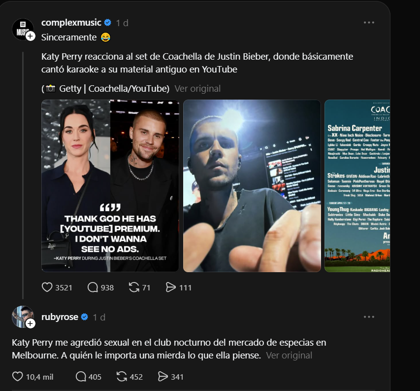La polémica surgió a raíz de un comentario en una publicación en la red social Threads, donde se resaltaba la reacción de Perry ante la actuación de Justin Bieber en Coachella. En ese contexto, la actriz Ruby Rose afirmó que la opinión de la cantante no es importante.