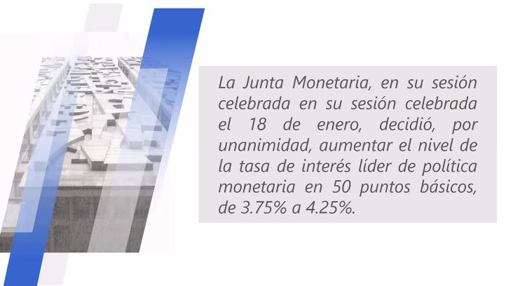 Ciudad de Guatemala, 19 ene (AGN).- La Junta Monetaria (JM) anunció en conferencia de prensa el aumento de la Tasa de Interés Líder de Política Monetaria de 3.75 % a 4.25 a partir del miércoles 18 de enero de 2023.
