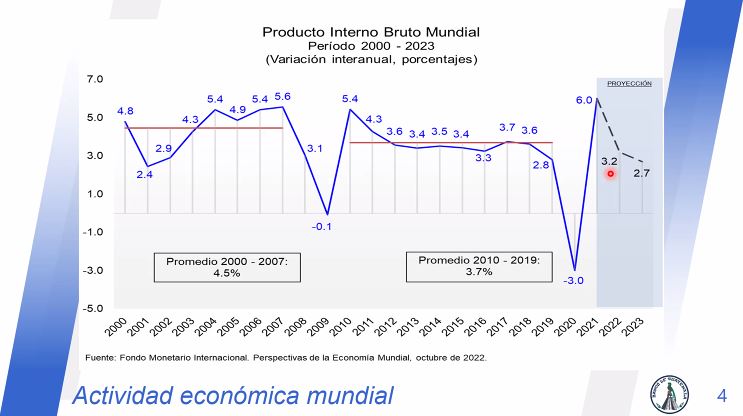 Además, recordó que el año pasado la economía mundial presento un crecimiento de 3.2 % y se espera que este 2023 la economía crezca un 2.7 %. Lo anterior, derivado de que las economías mundiales más importantes del mundo están en desaceleración.