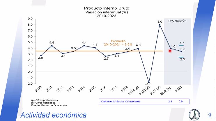 Para este año, derivado de la desaceleración económica mundial estamos previendo una tasa de crecimiento de 3.5 % consistente con el nivel de crecimiento de largo plazo de la economía guatemalteca, agregó Blanco.