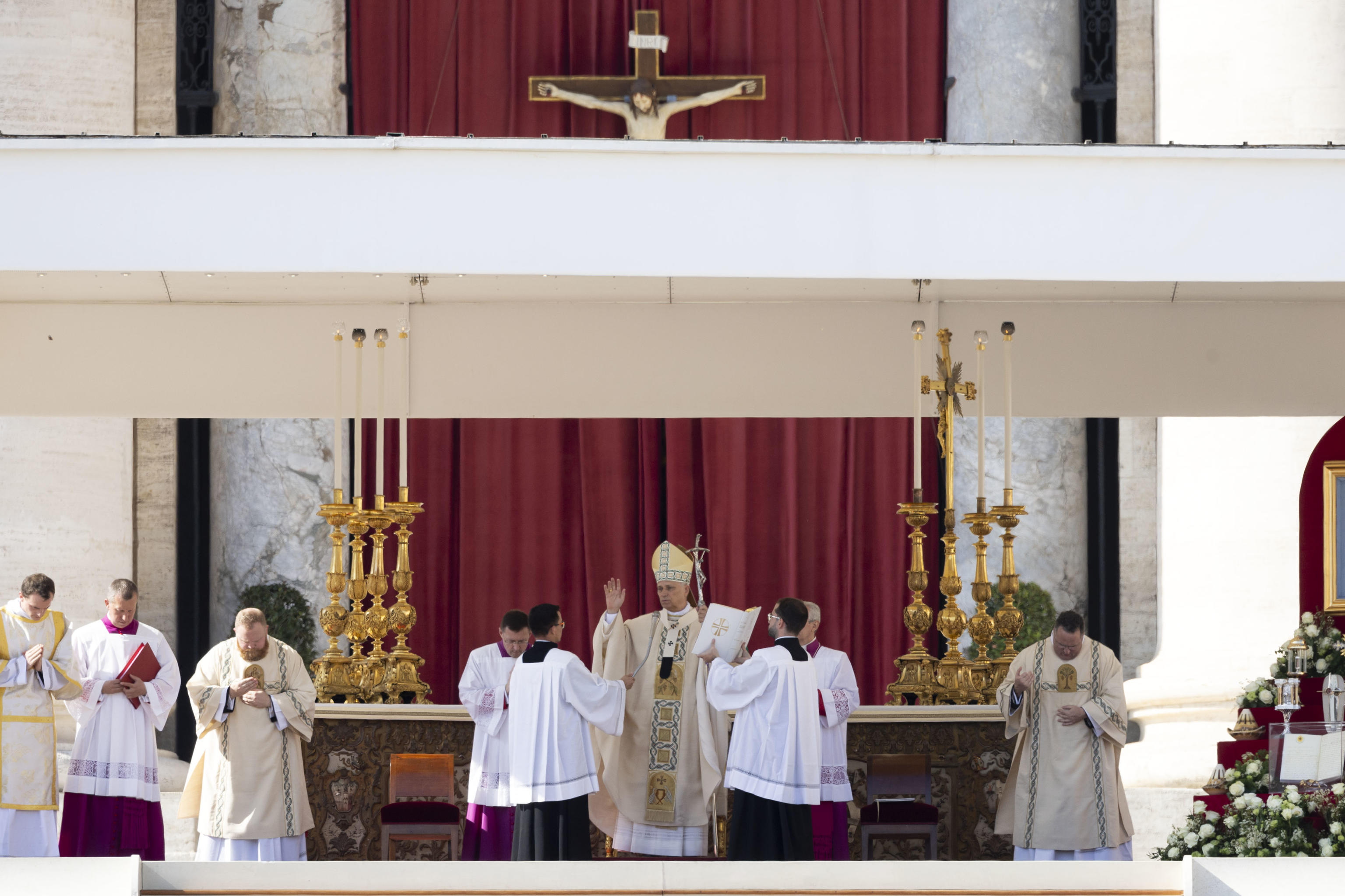 En la soleada plaza de San Pedro se desplegaron enormes retratos de los siete canonizados cuando el papa estadounidense-peruano salió de la basílica con una sotana ceremonial blanca.
