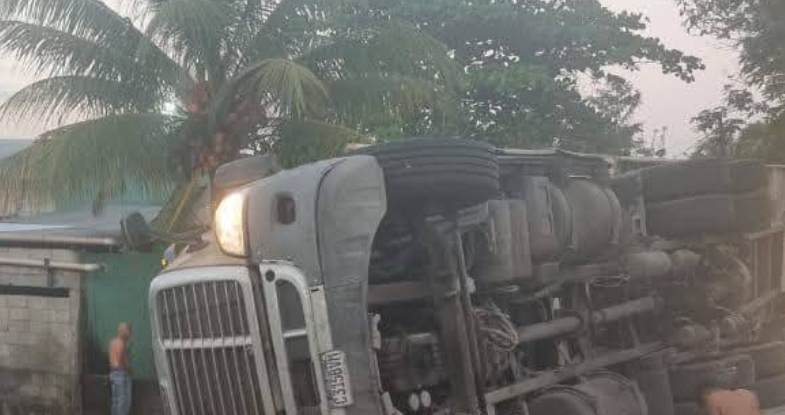 La unidad de carga quedó volcada sobre la cinta asfáltica mientras transportaba un contenedor, por lo que se recomienda a los conductores extremar precauciones al transitar por la zona.