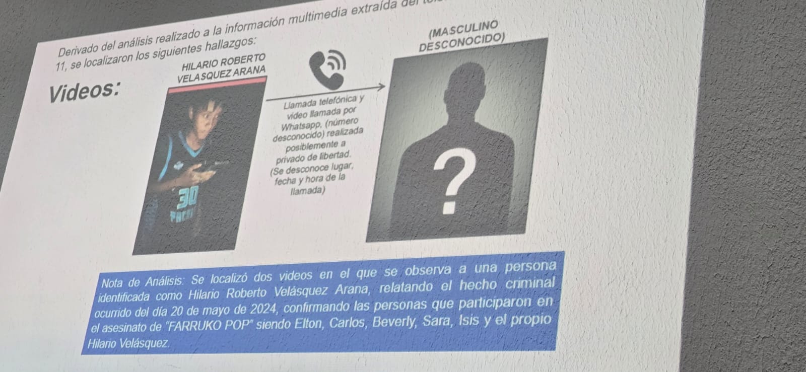 Posteriormente, se localizaron dos videos en donde se observa a Velásquez relatando lo ocurrido el 20 de mayo con el cantante, quien confirmó que los involucrados en el asesinato eran Elton, Carlos, Beverly, Sara, y el propio Velásquez.
