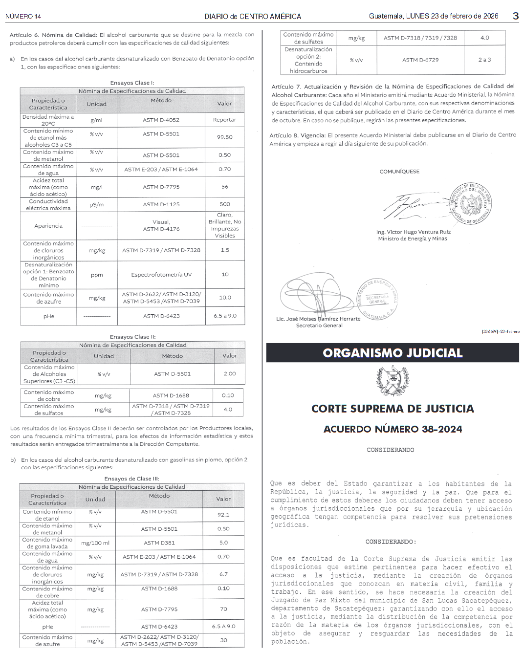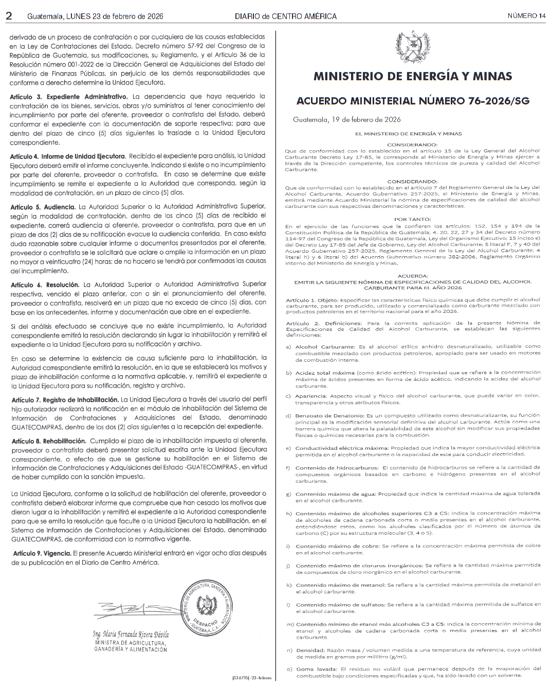 Se trata del Acuerdo Ministerial 76-2026/SG con el que el MEM emite la nómina de Especificaciones de Calidad del Alcohol Carburante para el 2026.