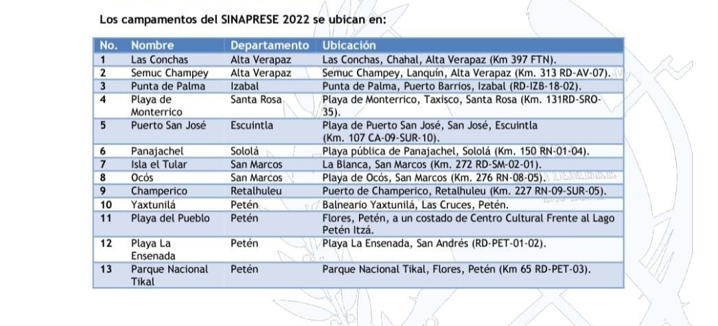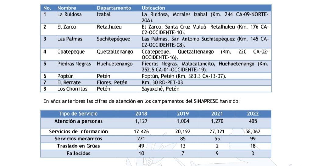El Gobierno de Guatemala, a través de la Secretaría Ejecutiva de la Conred, establecerá campamentos y puestos de control y prevención. Al respecto, los servicios que se brindarán en los campamentos son: