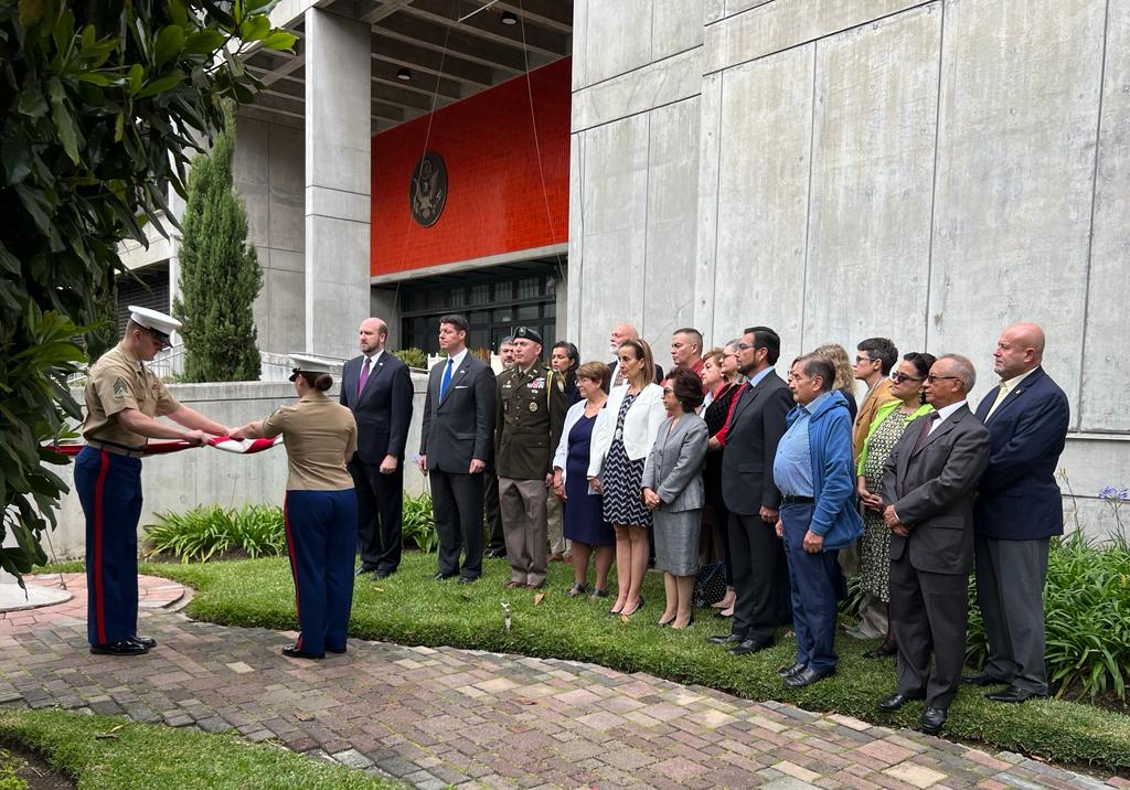 Durante esta ceremonia, la cual contó con la presencia del embajador, del ministro consejero Fennell, de otros oficiales estadounidenses y empleados guatemaltecos, elementos del Destacado de Seguridad de los Marinos arriaron bandera de Estados Unidos previo al traslado de la embajada a la zona 16 capitalina.