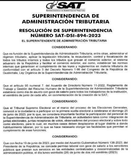 Los trabajadores de la Superintendencia de Administración Tributaria (SAT) gozarán de dos días de descanso laboral, como parte de la celebración del aniversario de la institución, así como por las elecciones generales 2023.