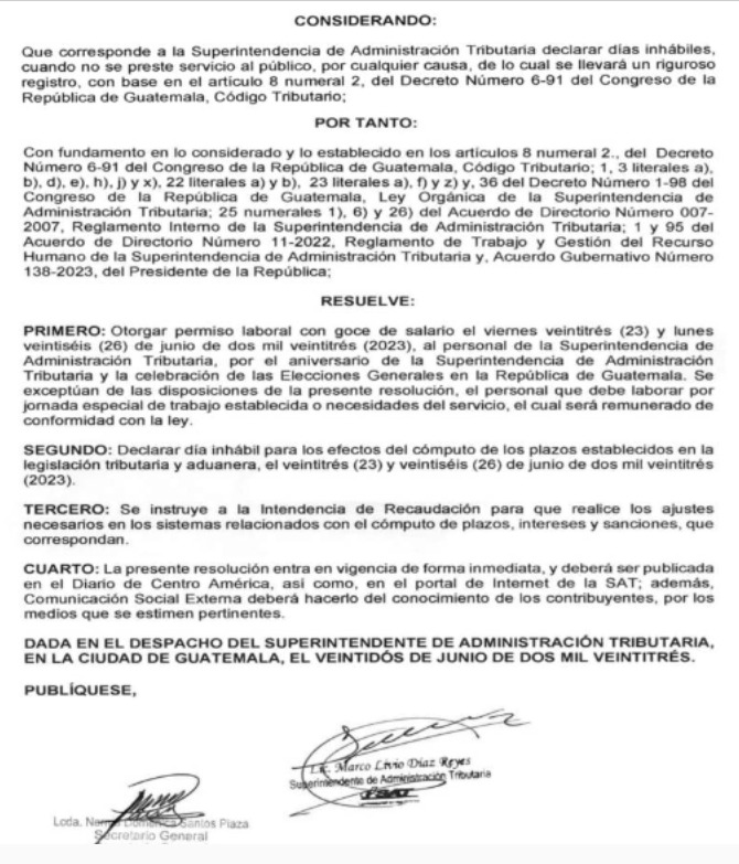 En el documento se resuelve también: “declarar día inhábil para los efectos del cómputo de los plazos establecidos en la legislación tributaria y aduanera el 23 y 26 de junio de 2023”.