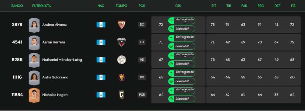 Las valoraciones de estos jugadores en el videojuego oscilan entre 64 y 72 puntos, siendo Andrea Álvarez, del Sevilla, la mejor calificada con 72, mientras que el guardameta de la selección nacional, Nicholas Hagen, tiene la puntuación más baja con 64.