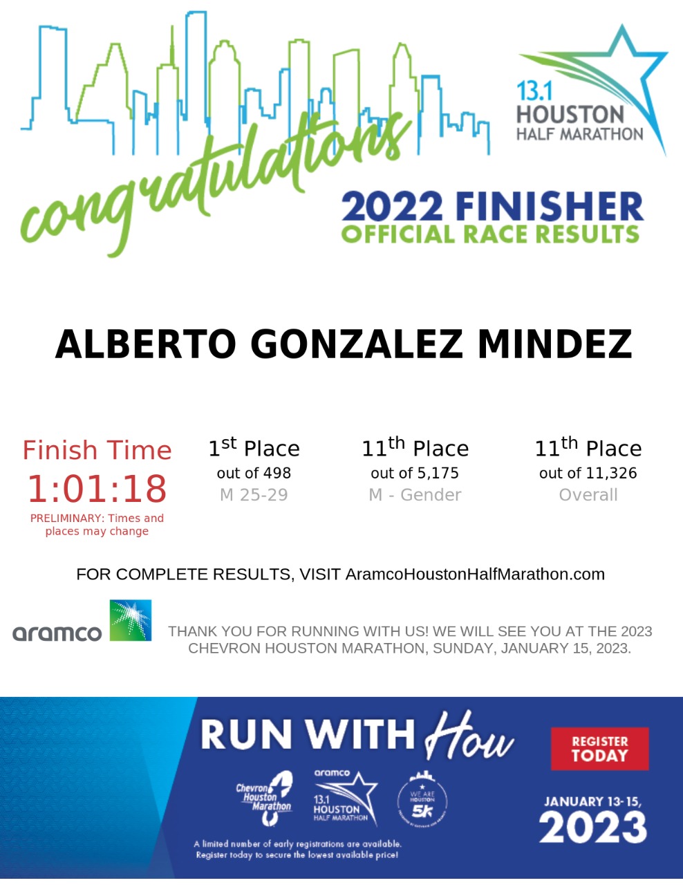 En otros resultados, el fondista nacional Luis Rivero también participó en el evento tejano, registrando un tiempo de: 1:36:07. Terminando en 44 lugar de 11,340 participantes.