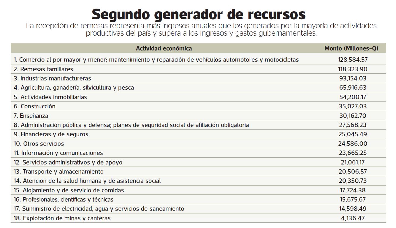 Dentro de la economía nacional, las remesas representan un monto importante al compararse con las actividades que conforman el PIB. En el 2021, el monto de divisas por ese concepto ascendió a unos Q118 mil 323 millones, que superó al monto registrado por 16 de las 17 actividades que constituyen el producto interno bruto.