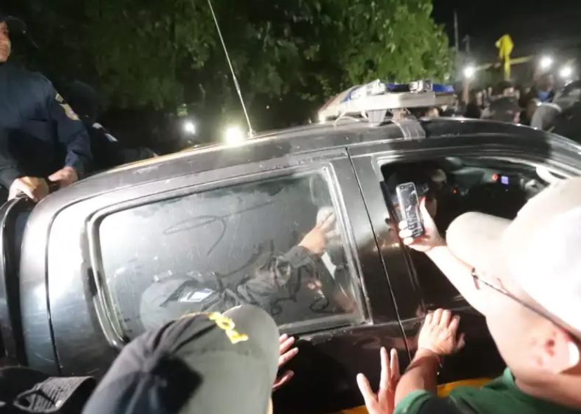 Foto que muestra el momento en que el menor acusado de decapitar a una madre en San Miguel Petapa era conducido por las autoridades. (Foto Prensa Libre: Daniel Samayoa)