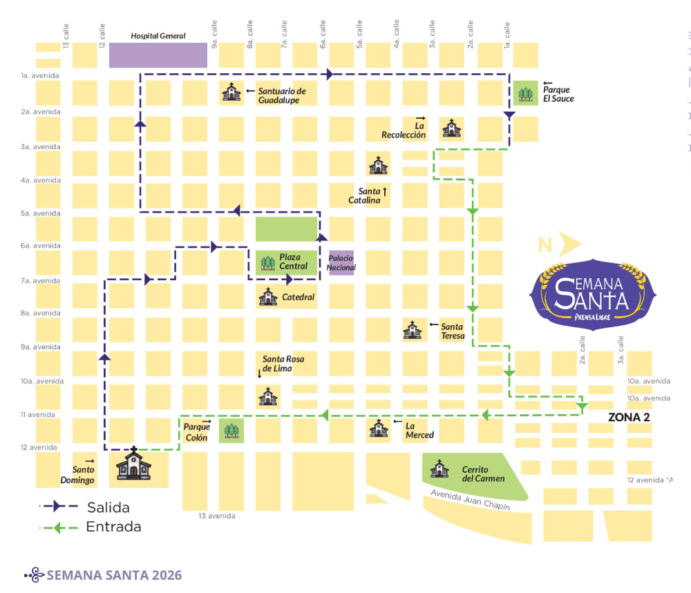 Mapa del recorrido procesional de Señor Sepultado Cristo del Amor del templo Santo Domingo. (Diseño: Prensa Libre)
